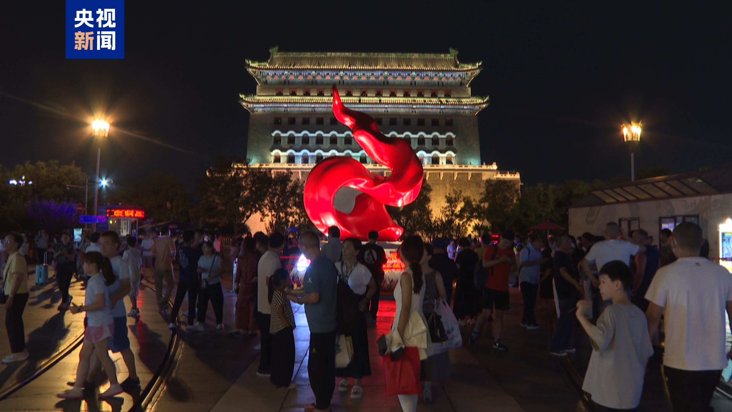 在中轴线前门大街北口设置主题景观雕塑“万众一心”,艺术化融汇红旗、巨龙、火焰与“众”字等元素,生动展现中华民族团结一心、奋勇向前的时代力量。