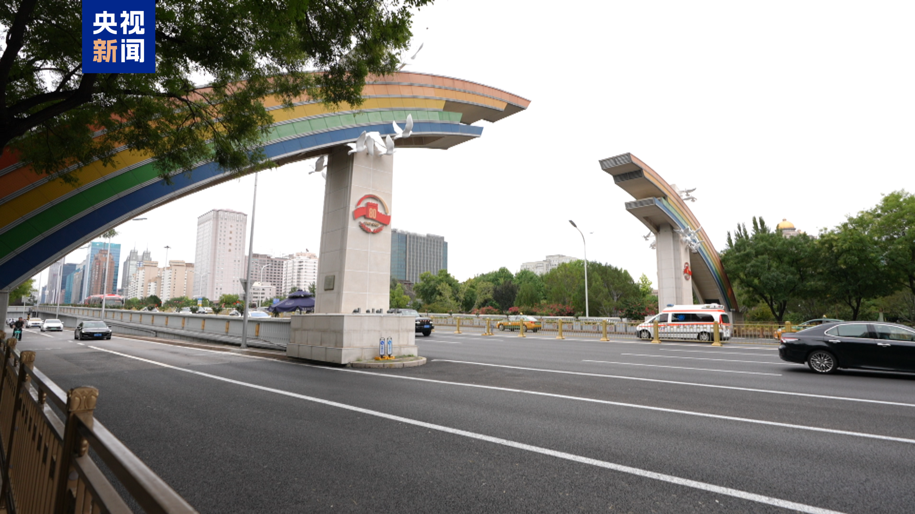 在建国门、复兴门两处彩虹门设置了纪念主题景观。14只鸽子翱翔彩虹穹顶,象征光明前景,立柱布置纪念活动标识,彰显仪式的庄严庄重,夜间彩虹门光影沿长安街贯通,展现从和平走向复兴的民族征程。